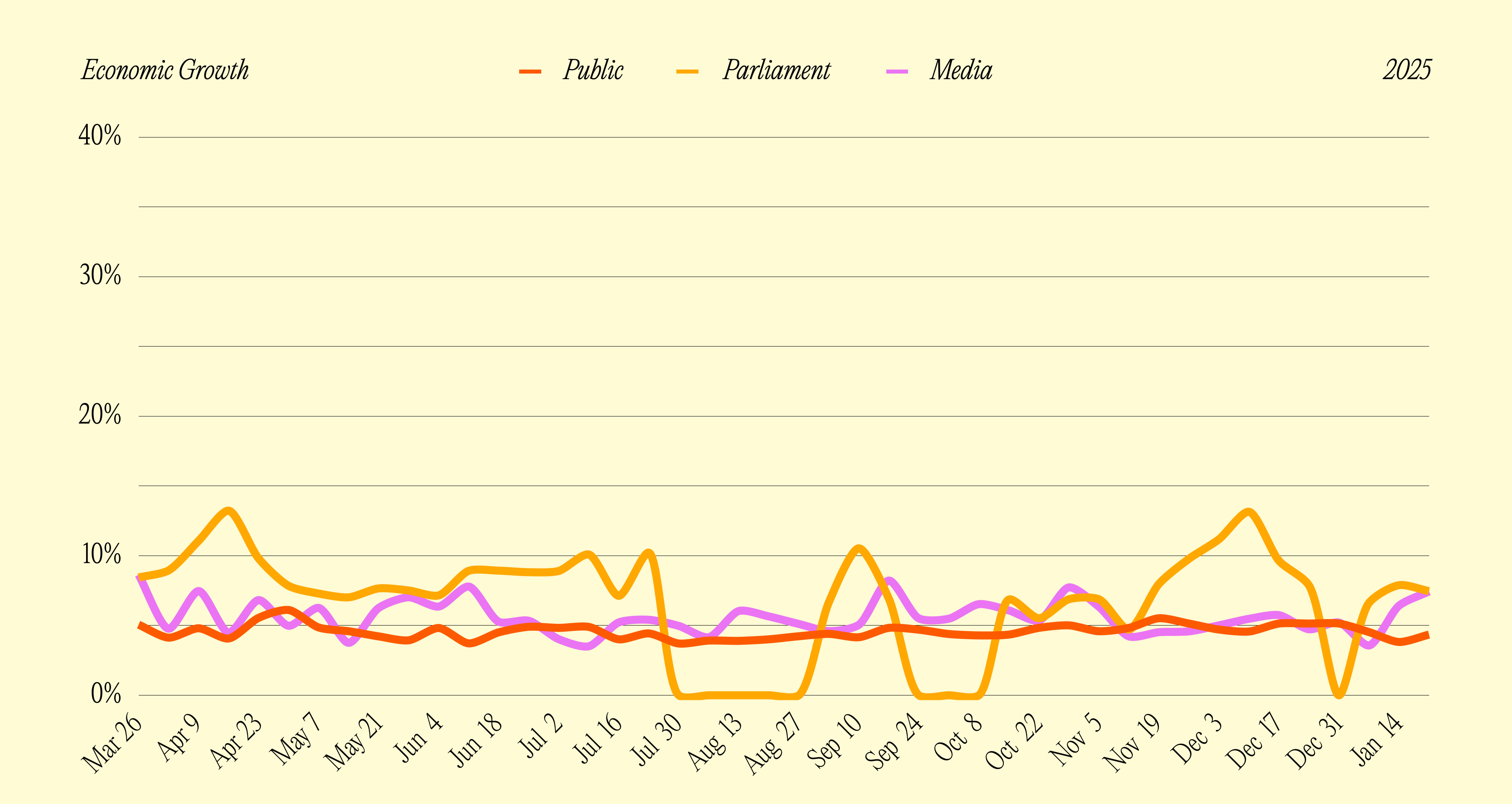The data reveals that Cost of Living dominates public concerns at 14.6%, reflecting the ongoing economic pressures facing UK households. This is followed by NHS concerns at 12.6%, highlighting persistent anxiety about healthcare provision despite recent government funding promises. Housing ranks third at 7.0%, indicating continued worries about affordability and availability in the property market. Climate Change (6.0%) and Crime (6.0%) complete the top five concerns, showing a near-equal split between environmental and security worries. Notably, there exists a significant misalignment between public priorities and both Parliamentary and media focus. While the public prioritises Cost of Living, Parliament devoted just 2.5% of its attention to this issue, instead focusing on Infrastructure (12.9%), Crime (12.2%), and Housing (11.6%). The media's coverage was dominated by Crime at 18.7%, with Education (10.8%) and Economic Growth (8.6%) receiving substantial attention. This discrepancy suggests a communication gap between citizen priorities and institutional responses. The NHS, despite being the second-highest public concern, received moderate attention in Parliament (9.2%) but limited media coverage (4.6%). Technology shows the most significant divergence, with minimal public concern (0.7%) but substantial media focus (6.7%), likely reflecting industry influence on news agendas. Employment concerns (5.4%) appear under-represented in both Parliament (4.1%) and media (1.7%), despite their importance to household financial security. Immigration demonstrates another misalignment, with public concern (5.8%) receiving minimal Parliamentary attention (1.2%) but moderate media coverage (4.2%). These disparities highlight how institutional agendas can diverge from public sentiment, potentially affecting policy responsiveness and public trust in governance structures during this period of economic uncertainty.