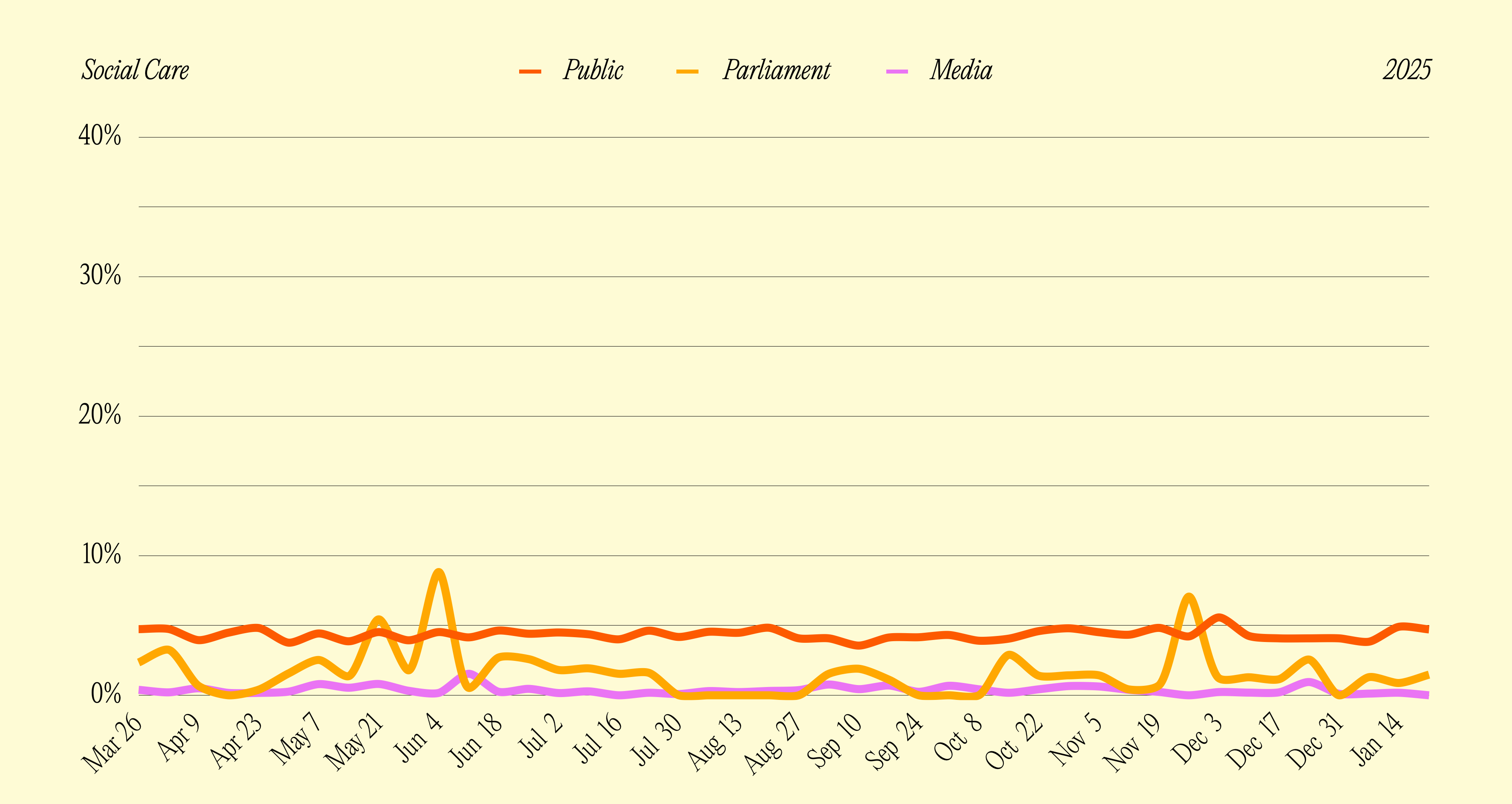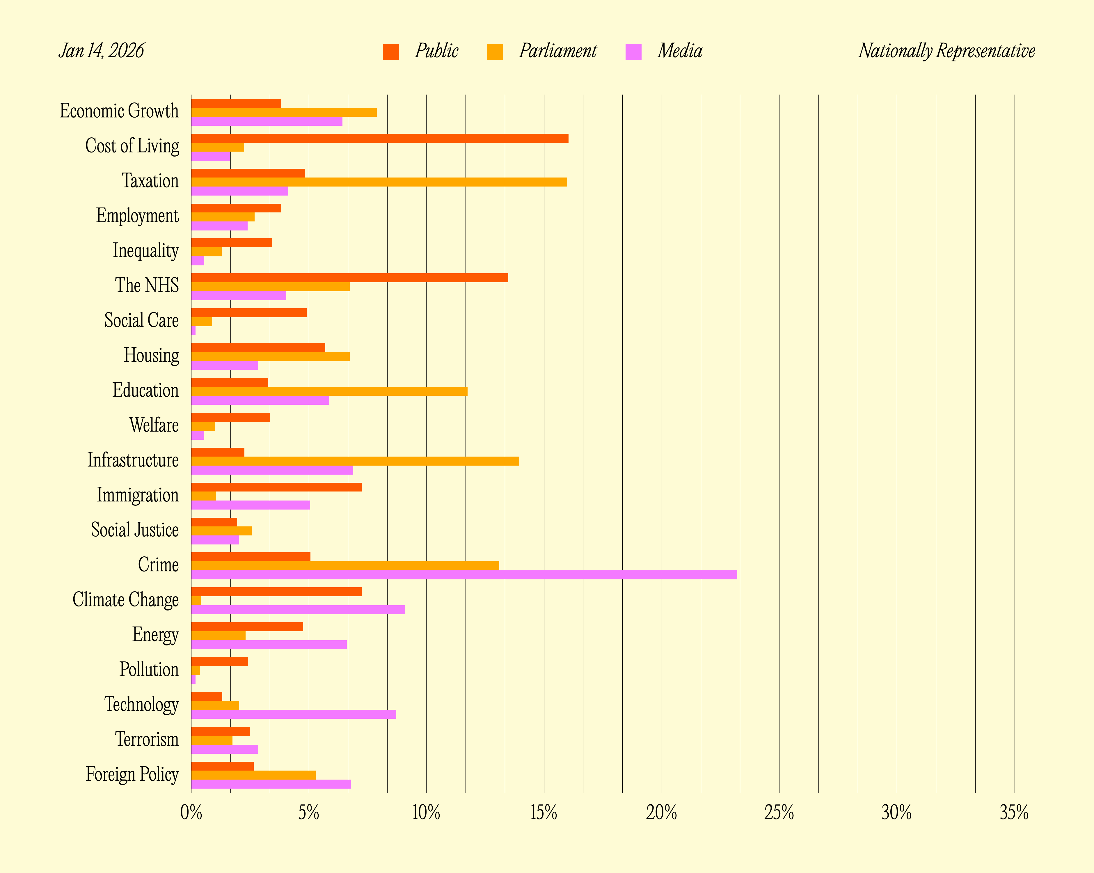 Cost of living remains the dominant public concern at 15.7%, though this represents a modest decline from the previous week's 15.9%, maintaining its position as the most pressing issue for the British public. Immigration has risen to 8.6%, continuing its sustained upward trajectory across recent months to establish itself firmly as the second-highest public priority, having climbed from around 8.1% just a week earlier. The NHS registers at 11.8%, maintaining relatively stable levels around 12% throughout the autumn period, though this marks a slight decrease from the previous week's 12.2%. Crime stands at 5.5%, showing week-to-week volatility but remaining consistently within the 5-6% range that has characterised public concern about this issue throughout the latter months of 2025. Climate change measures 6.2%, having declined notably from peaks above 8% recorded earlier in the year, whilst housing concerns rest at 5.8%, persisting at broadly similar levels since October. Taxation sits at 4.8%, representing a decrease from last week's 5.4%, and social care has increased notably to 5.6%, marking one of its higher readings in recent weeks and suggesting growing public attention to this policy area. Parliamentary attention diverges sharply from public priorities, with taxation receiving 14.4% of debate time despite commanding just 4.8% of public concern, whilst cost of living receives only 5.8% of parliamentary time against its 15.7% public weighting. Economic growth attracted 11.2% of parliamentary debate, considerably exceeding its 4.7% public priority level. Media coverage shows crime dominating at 25.6%, substantially exceeding its 5.5% public priority rating and continuing the pattern of disproportionate media focus on crime-related stories throughout recent months. Infrastructure receives 8.3% of coverage despite registering merely 2.3% public concern, whilst climate change attracts 8.6% of media attention, noticeably above its 6.2% public priority level.