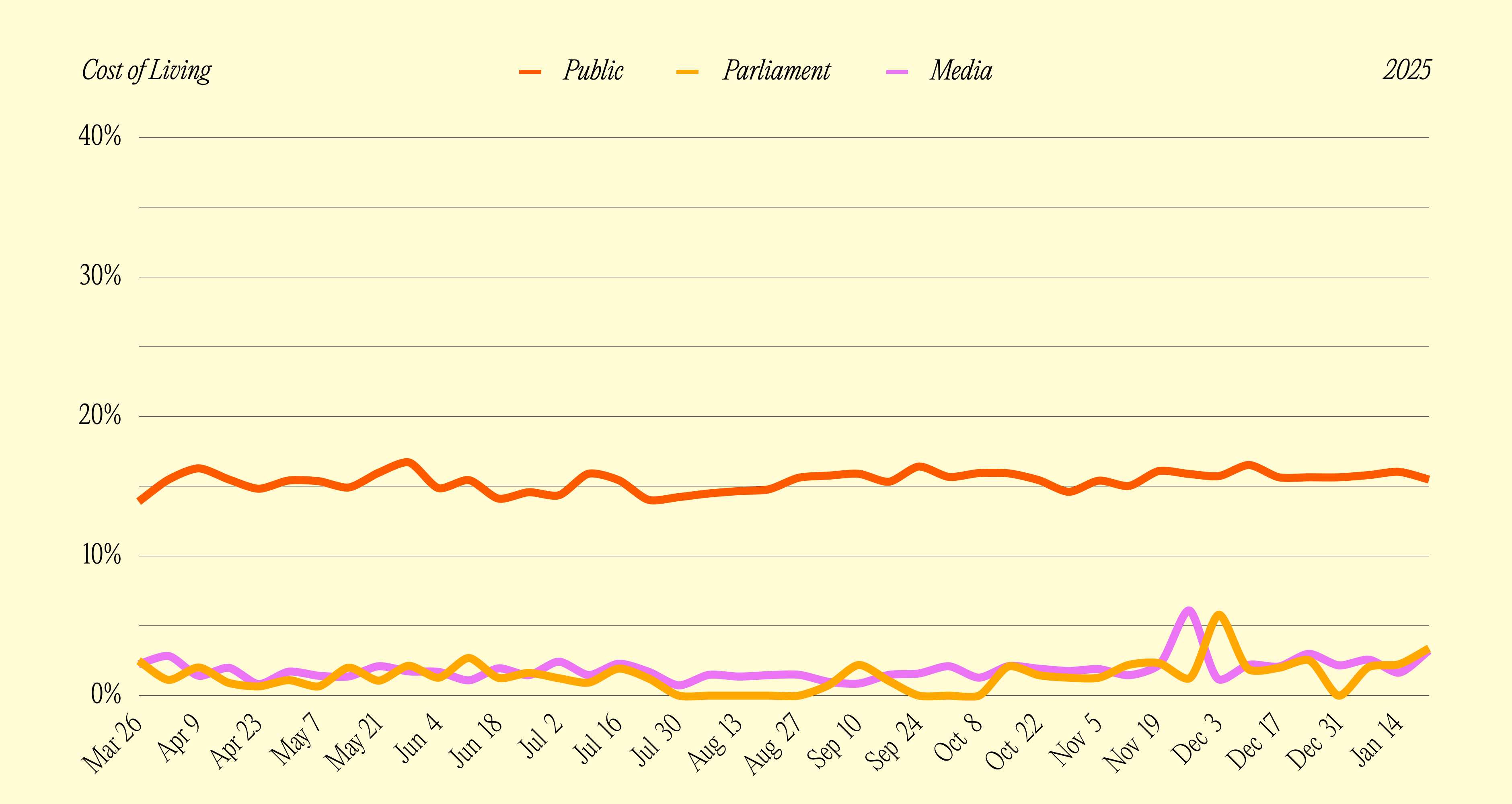"Cost of living receives 1.1% of Parliamentary debate time and 1.7% of media coverage" - CORRECT. Parliament (1.11%) and Media (1.72%).