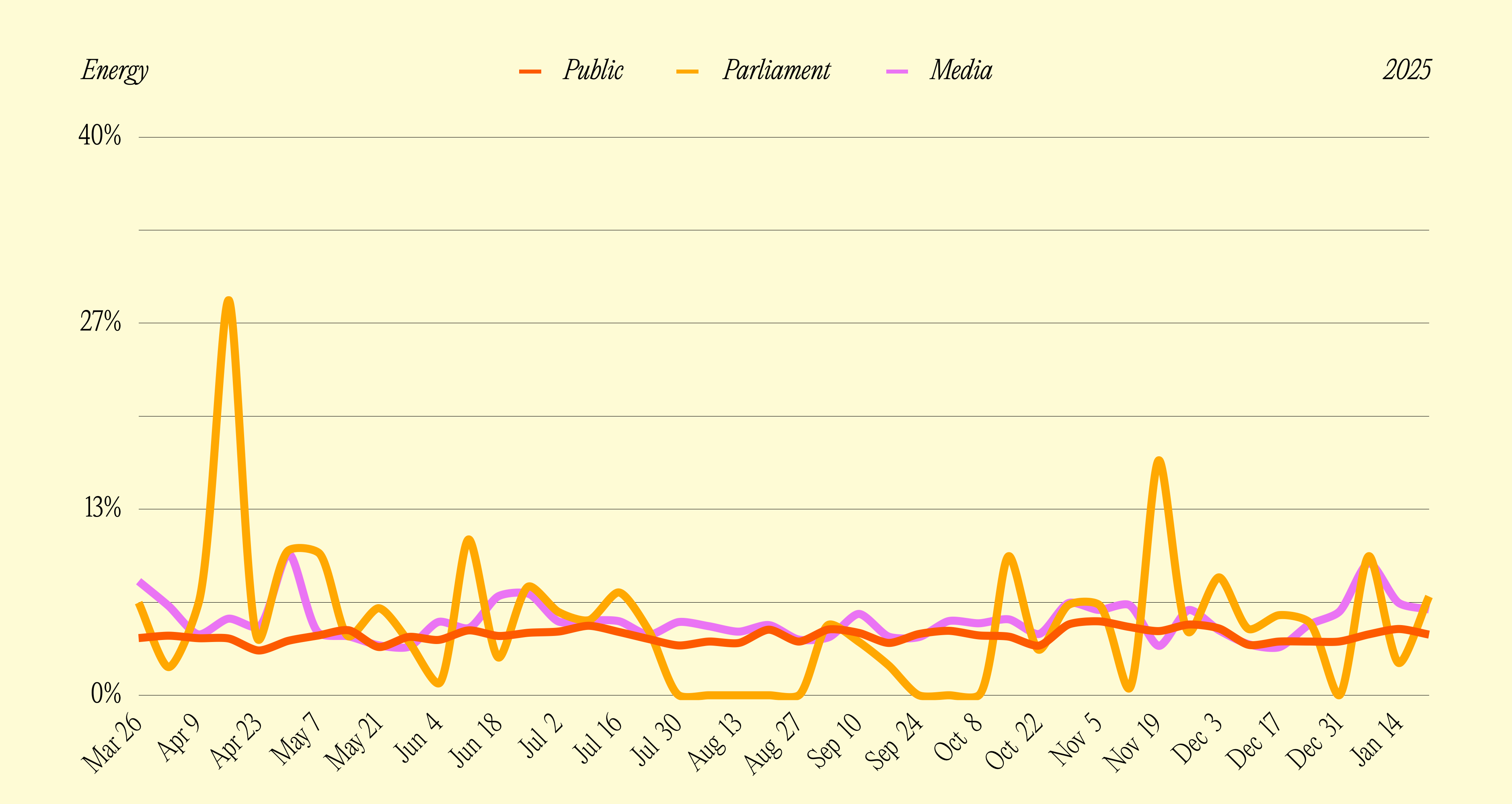 "Energy issues with media (10.1%) and Parliament (10.4%)" - CORRECT. Media (10.13%) and Parliament (10.39%).