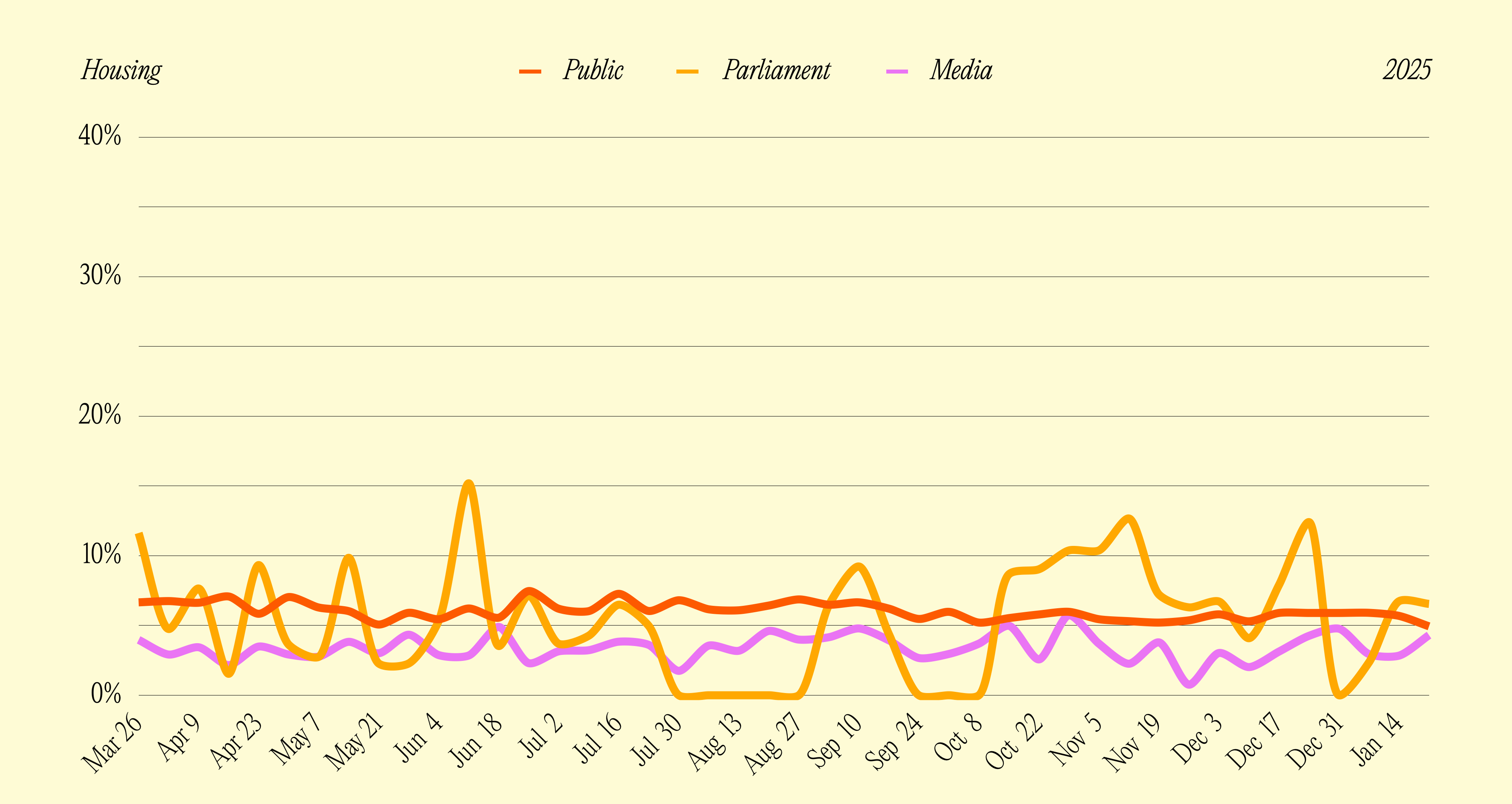 "Housing receives proportionally less attention in Parliament (3.6%) and media (2.9%)" - CORRECT. Parliament (3.63%) and Media (2.92%).