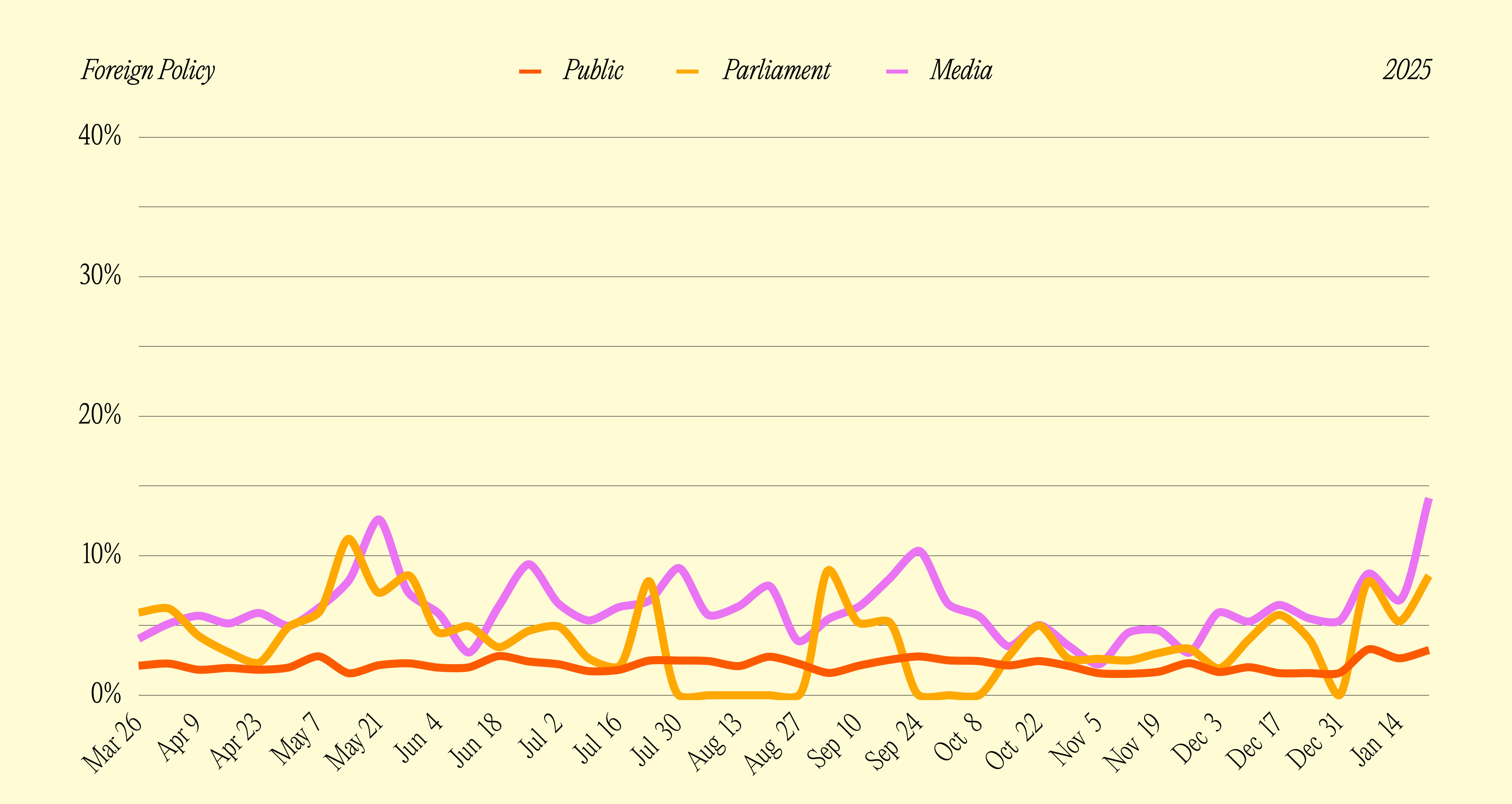The Cost of Living remains the dominant public concern at 15.98%, despite a slight decline from its peak of 16.29% in early April. This enduring economic anxiety is complemented by the NHS at 12.14%, which has stabilised after previously falling from 12.65% in early April. Immigration has shown one of the most notable long-term upward trajectories, reaching 7.83%, reflecting a steady two-month climb from 5.84% in late March. Climate Change maintains its position as a top-five concern at 7.45%, though down from its mid-May peak of 8.11%. Housing concerns have declined substantially from 6.98% in March to 5.07%, possibly reflecting the impact of recent government housing initiatives announced in the spring budget. Crime remains steady at 5.53%, showing remarkable consistency throughout the entire quarter. Social Care has risen to 4.53%, reversing its previous downward trend, while Inequality has returned to prominence at 4.22% after falling as low as 2.99% in late April. Economic Growth has declined significantly from its April peak of 6.11% to 4.22%, suggesting reduced anxiety about recession as the Bank of England's last quarterly report showed modest growth. The gap between public concern and institutional attention is most pronounced in Cost of Living, which receives minimal Parliamentary focus (1.08%) and media coverage (2.11%) despite being the public's overwhelming priority. Conversely, Crime dominates media coverage at 24.31% and Parliamentary attention at 20.84%, disproportionate to public concern. Foreign Policy has gained significant media traction at 12.60%, likely due to ongoing tensions in Eastern Europe and developments in Middle East peace negotiations. Education concerns have remained relatively stable at 3.99%, though Parliamentary attention at 9.46% and media coverage at 8.94% far exceed public prioritisation. Technology issues remain a low public concern at just 1.69%, despite consistent media coverage at 5.28%.