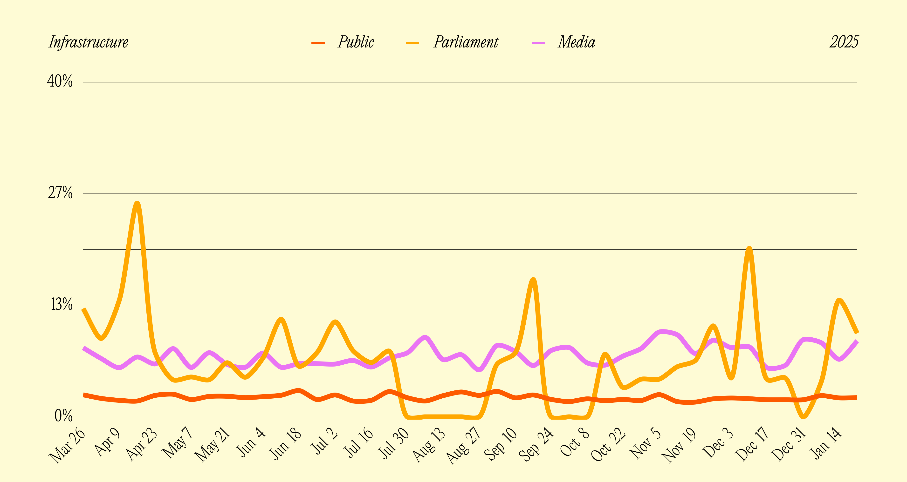 Cost of living remains the dominant public concern at 16.5%, maintaining its position as the most pressing issue for the British public and showing a modest increase of 0.8 percentage points from last week. The NHS follows at 13.2%, showing a notable increase of 1.4 percentage points from the previous week, marking a sustained upward trend since late November when it stood at 11.7%. Immigration stands at 8.6%, consolidating its position as the third major concern after showing steady growth throughout the autumn months from around 8.0% in October. Crime registers at 6.6%, representing an increase of over one percentage point from last week and continuing its volatile pattern across recent months. Climate change reaches 7.4%, reflecting continued public attention to environmental issues despite minimal parliamentary debate on the subject, which registered just 0.7% this week. Housing concern has declined to 5.3%, dropping 0.5 percentage points from last week's figure and continuing a downward trend from its October peak above 6.0%. Economic growth stands at 4.6%, whilst taxation concerns register at 4.7%, both remaining relatively stable compared to previous weeks. The cost of living crisis continues to dominate public discourse despite relatively modest parliamentary attention of just 1.9%, highlighting a persistent disconnect between public priorities and Westminster focus that has characterised much of 2025. Parliamentary debate this week was heavily weighted toward infrastructure at 20.1%, followed by economic growth at 13.2% and education at 8.5%, demonstrating a policy agenda that diverges substantially from immediate public concerns about household finances and health services. The infrastructure focus in Parliament appears driven by ongoing policy announcements and investment debates relating to transport and regional development projects. Media coverage was led by crime stories at 22.8%, followed by the NHS at 10.6% and education at 10.0%.