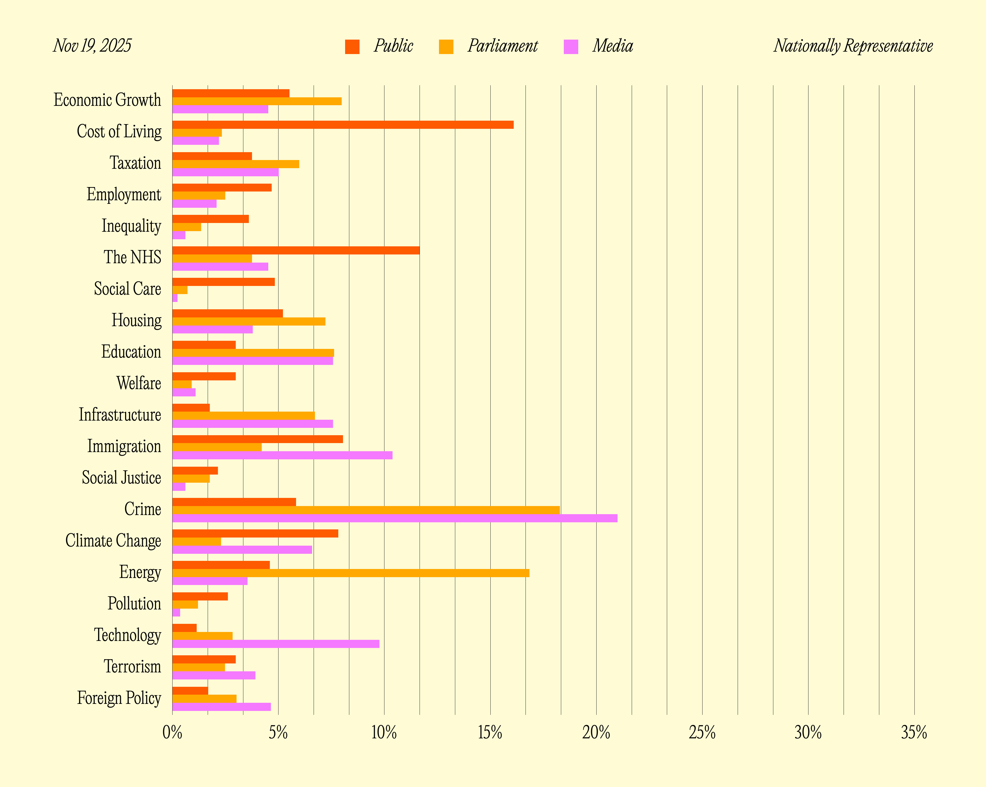 Cost of living remains the dominant public concern at 14.6%, maintaining its position as the issue most urgently requiring attention across recent weeks. The NHS follows at 12.3%, reflecting sustained pressure on health services and consistent public anxiety about healthcare access and quality. Immigration stands at 8.4%, continuing its multi-week presence amongst top priorities, whilst climate change holds at 6.7%, showing relatively stable concern levels. Housing registers 6.0%, demonstrating consistent mid-tier prioritisation, whilst crime sits at 5.2%, maintaining steady levels of public attention. Economic growth reaches 5.0%, marking a modest increase from the previous week's 4.8%, whilst energy concern rises notably to 5.1%, representing the highest level observed in several weeks and potentially reflecting seasonal factors as winter approaches alongside recent policy discussions. Education at 3.8% and taxation at 4.1% remain stable mid-tier concerns, with the latter showing little movement despite ongoing Budget-related discourse. Parliamentary attention during this period demonstrates notably elevated focus on crime at 19.0%, reflecting legislative activity on public safety measures, whilst taxation commands 9.7% of parliamentary time, likely connected to the government's recent Autumn Budget statement and subsequent debates about fiscal policy. Housing receives 10.4% of parliamentary debate, suggesting continued legislative priority in this area, whilst the NHS commands 9.1% of parliamentary time, though this represents considerably less attention than the public priority level would suggest. Education attracts 8.5% of parliamentary focus, somewhat exceeding its public concern level, whilst infrastructure receives 4.5% of parliamentary attention. Immigration garners merely 1.0% of parliamentary time, creating a substantial and persistent gap between public concern at 8.4% and political focus on this issue, a disparity that has characterised recent weeks.