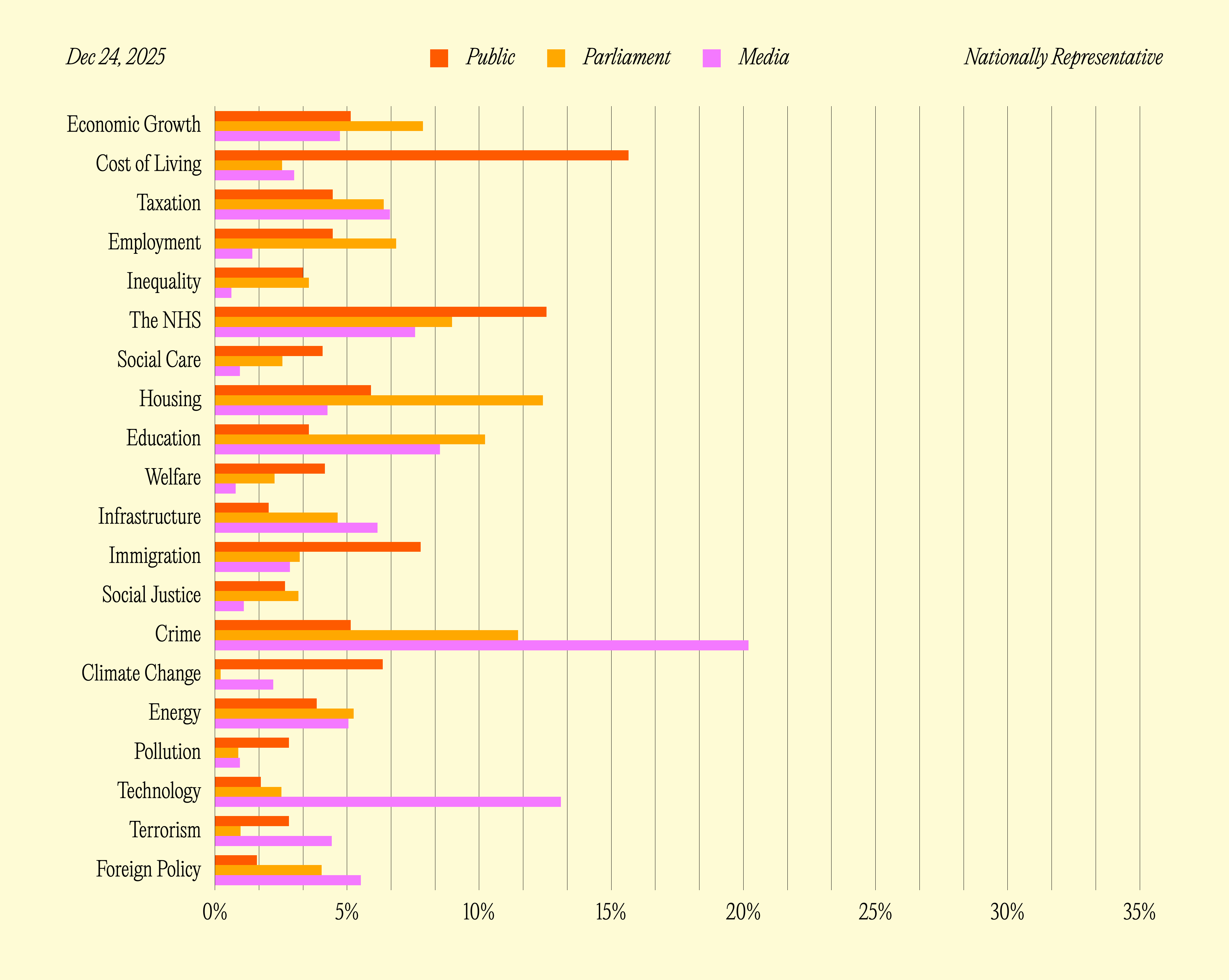 Cost of living remains the dominant public concern at 15.6%, maintaining its position as the most pressing issue throughout 2025, though showing a modest decline from the 16.5% recorded on 10 December. The NHS follows at 12.6%, experiencing a slight uptick of 0.1 percentage points from the previous week, whilst immigration sits at 7.8%, down 0.8 percentage points in a continuation of its gradual decline since mid-November when it peaked at 8.6%. Climate change holds steady at 6.4%, housing at 5.9%, and crime at 5.1%, with all three maintaining relatively stable positions across recent weeks. The data demonstrates a consistent pattern whereby bread-and-butter economic concerns dominate public attention, with healthcare maintaining strong secondary focus, whilst issues such as terrorism (2.8%) and foreign policy (1.6%) command comparatively limited public priority despite their media prominence. Parliamentary attention during the final sitting week before the Christmas recess focused heavily on crime (11.5%) and housing (12.4%), alongside substantial debate on economic growth (7.9%) and education (10.2%), though cost of living received merely 2.5% of debate time despite its overwhelming public salience. This disconnect between public priorities and parliamentary focus remains particularly stark in the economic sphere, where the issue dominating public concern receives minimal legislative attention. Media coverage patterns reflected the traditional end-of-year news cycle, with crime dominating at 20.2%, followed by technology at 13.1%, a notable spike driven by year-end technology reviews and digital safety stories. Climate change received just 2.2%, its lowest level since October, suggesting environmental concerns were displaced by seasonal crime reporting and festive consumer technology coverage in the final week before Christmas.