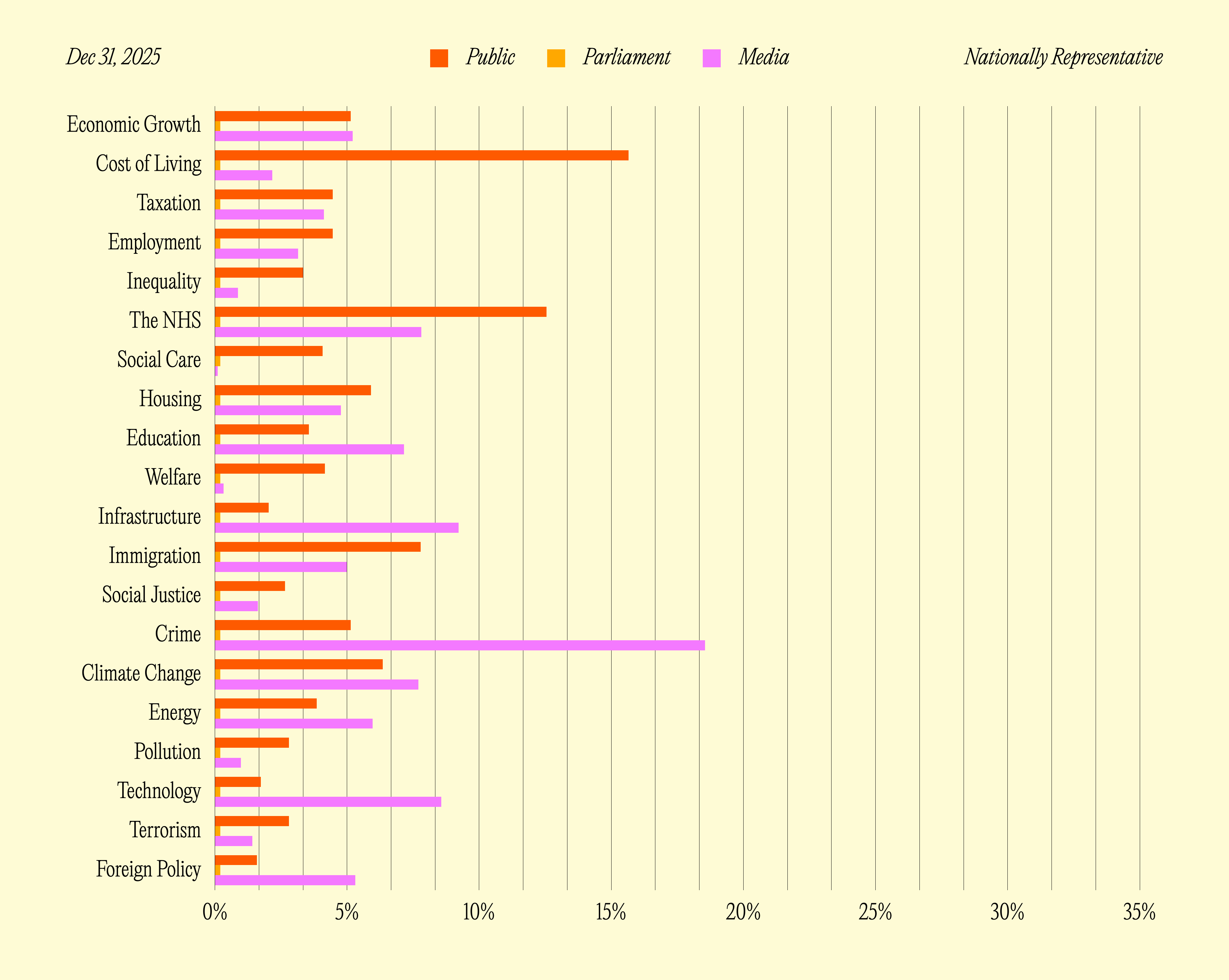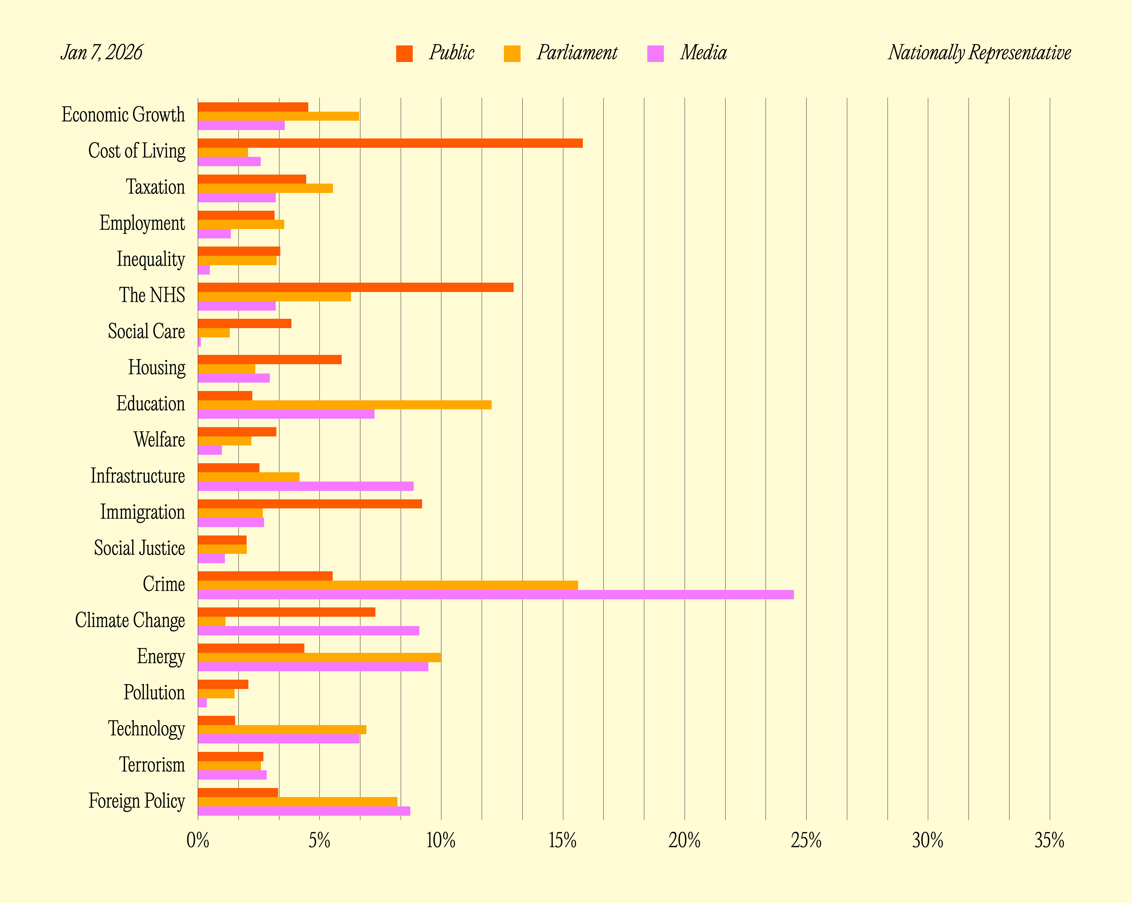 Cost of living remains the dominant public concern at 15.7%, maintaining exactly the same level as the previous week and continuing the position it has held throughout the year. The NHS follows at 12.6%, also unchanged from the week ending 24 December, demonstrating consistent strength as a public priority. Immigration ranks third at 7.8%, holding steady without any week-on-week movement as the year concludes. Climate change sits at 6.4%, whilst economic growth and crime both register 5.1%, showing stable public attention across these mid-tier concerns. Housing remains at 5.9%, maintaining its position amongst public priorities. Welfare concern stands at 4.2%, whilst education holds at 3.6%, both reflecting relatively unchanged public sentiment in the final week of the year. Taxation registers 4.5% concern, and social care maintains 4.1%, completing a picture of remarkable stability across the board as 2025 draws to a close. Parliamentary data remains unavailable for the final week of the year due to the Christmas recess, continuing the pattern established during the holiday period. In media coverage, crime continues to dominate at 18.6%, though this represents a decrease of 1.6 percentage points from the previous week, reflecting slightly reduced reporting intensity during the holiday period. Infrastructure coverage increases to 9.2%, up from 6.2%, whilst technology coverage falls to 8.6%, down 4.5 percentage points from its elevated position the previous week. Climate change coverage rises notably to 7.7%, up 5.5 percentage points, potentially driven by year-end environmental reviews and retrospectives. The NHS receives 7.8% of media attention, and education 7.2%, both maintaining reasonable coverage levels. The persistent disconnect between public priorities and media attention remains evident, with crime receiving more than three times the media coverage of its public concern level, whilst cost of living garners proportionally minimal media focus despite consistently topping public concerns throughout 2025.